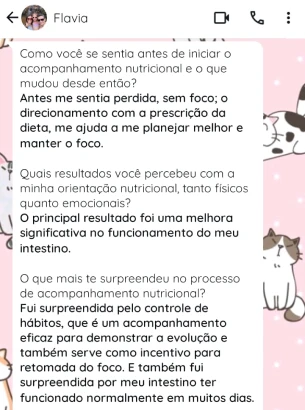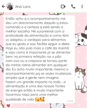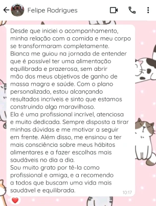 Acredito que cada pessoa tem sua própria rotina e desafios, e que uma alimentação saudável precisa se adaptar a isso – e não o contrário. Meu atendimento é baseado na escuta, no acolhimento e na construção de estratégias reais para sua vida.